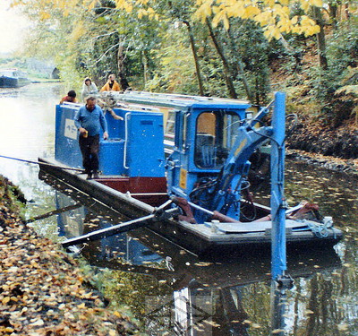 Similarly, this small dredger was 'playing with mud' on the Mon & Brec Canal in 1986. It was essentially a mini-digger mounted within a work flat. The sum total of the dredging team on this waterway seemed to comprise this vessel and a dump truck on the towpath to dispose of dredgings. CD