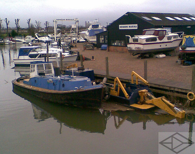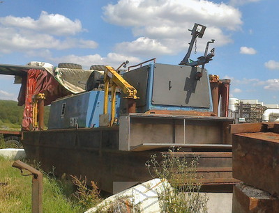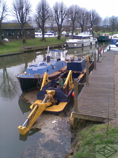 RP2 - a rare example of clever thinking. This 'ramp pan' allowed a conventional land-based, tracked excavator, or tractor to be used on the water. This could then be used for bank clearance or dredging aftr being loaded off any bank with a suitable height. Clever idea - but this one, covered in odd timbers and rubbish, was on its way to be sold in 2010.