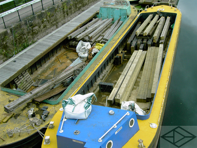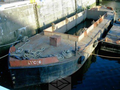 Typical mud hopper used ubiquitously for canals, rivers and harbours. Note the built up coamings on the edges of the hold and the spacious 'unused' floatation areas at each end.