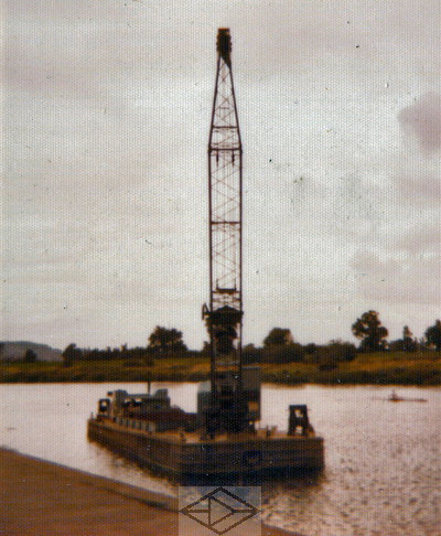 Another view of the same crane boat earlier in 2009. These 'motor crane boats' were originally wire rigged girder lattice cranes which could be used for dredging or general lifting. The hydraulic replacements seem like a good 'upgrade' but the hydraulic jibs are apparently prone to bending in half under stress!